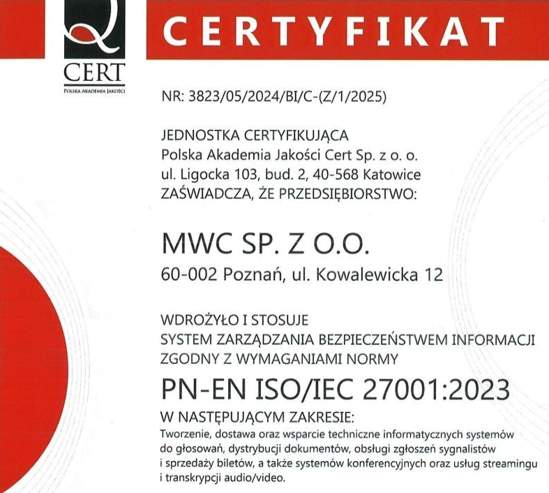 certyfikat ISO 27001 potwierdza wysokie standardy bezpieczeństwa